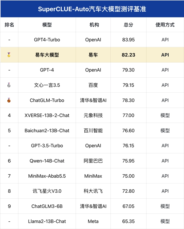 以科技创新,AI 大模型为抓手, 易车打开行业数智生产力的想象边界。在汽车大模型测评基准 SuperCLUE-Auto 的测评中, 易车大模型取得 82.23 分, 刷新国内大模型最好成绩, 与 GPT4-Turbo 相差 1.72 分。